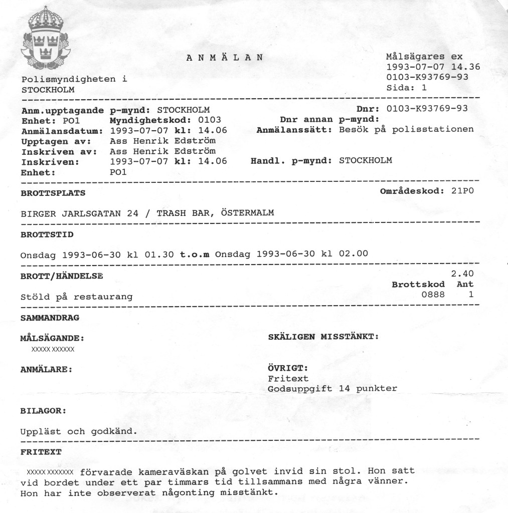 Det bör förklaras varför jag anmälde min ”stulna” väska. Efter en sedvanligt intensiv kväll på Trash Bar släpade jag med mig en kille hem till Fredhäll. Han betalade taxin. När jag ska låsa upp porten upptäcker jag att jag inte har någon väska och alltså inga nycklar. Vi åker hem till honom i Alvik istället.